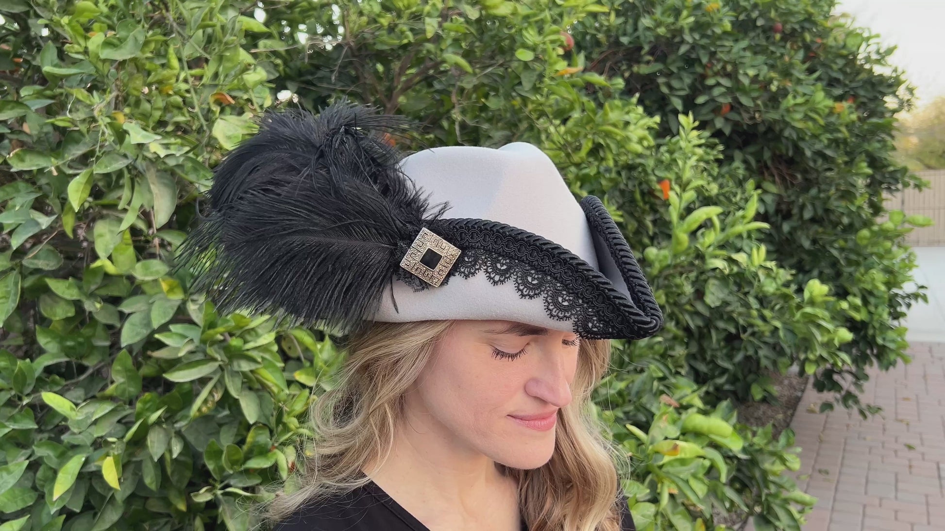 Bicorn Hat 22.5" Grey Polyester Base with Black Trim, Feathers, and Silver Brooch
