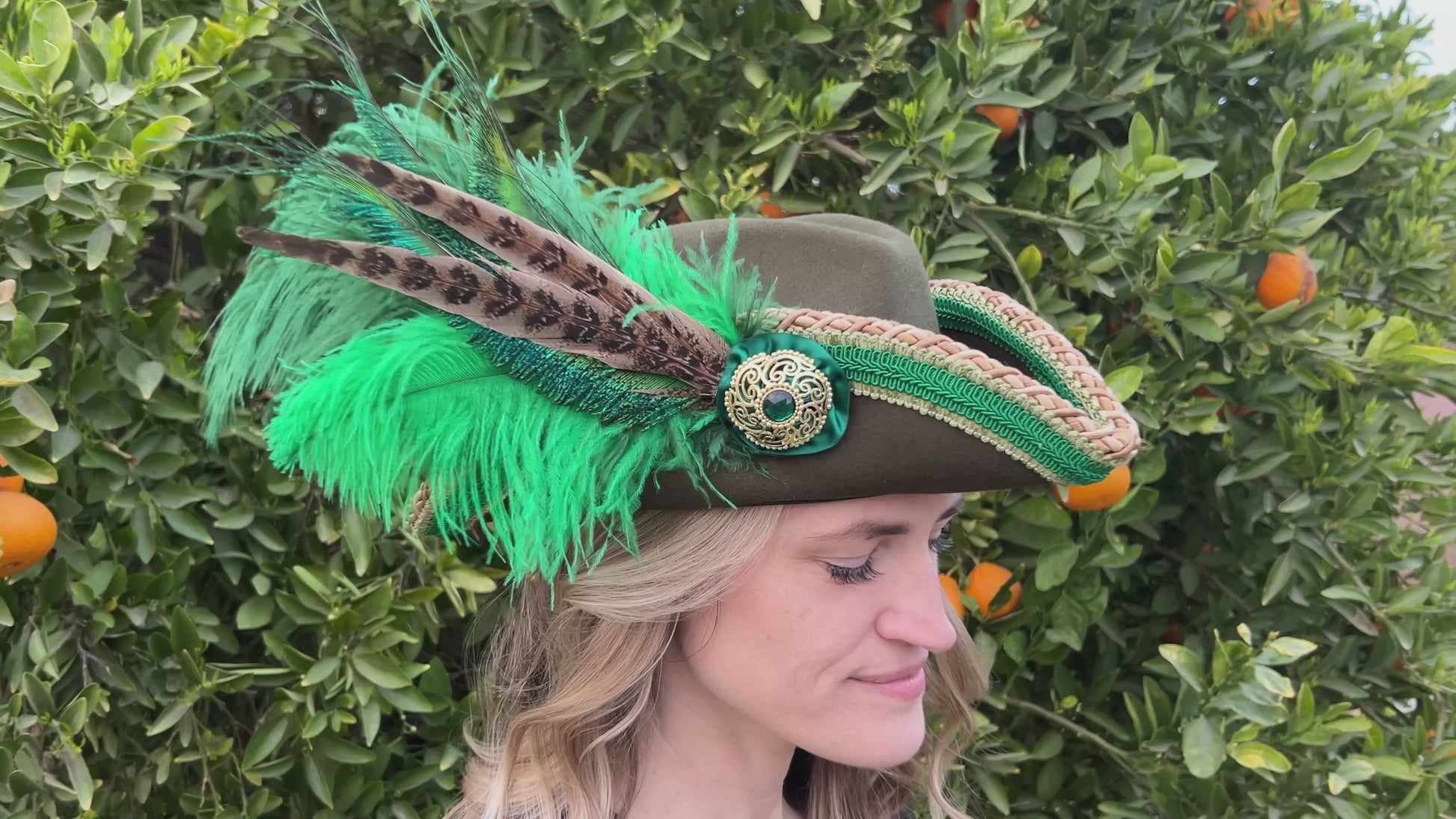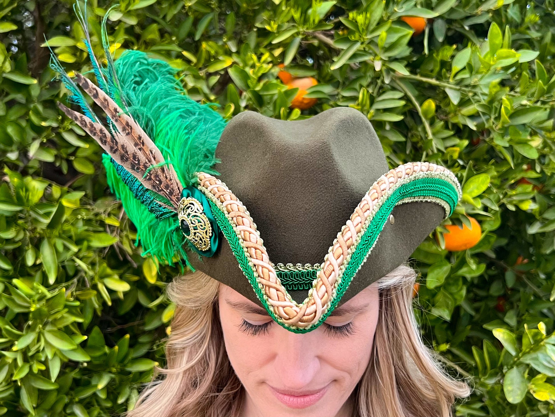Bicorn Hat 22" Green Polyester Base with Gold/Green Trim, Feathers, and Brooch
