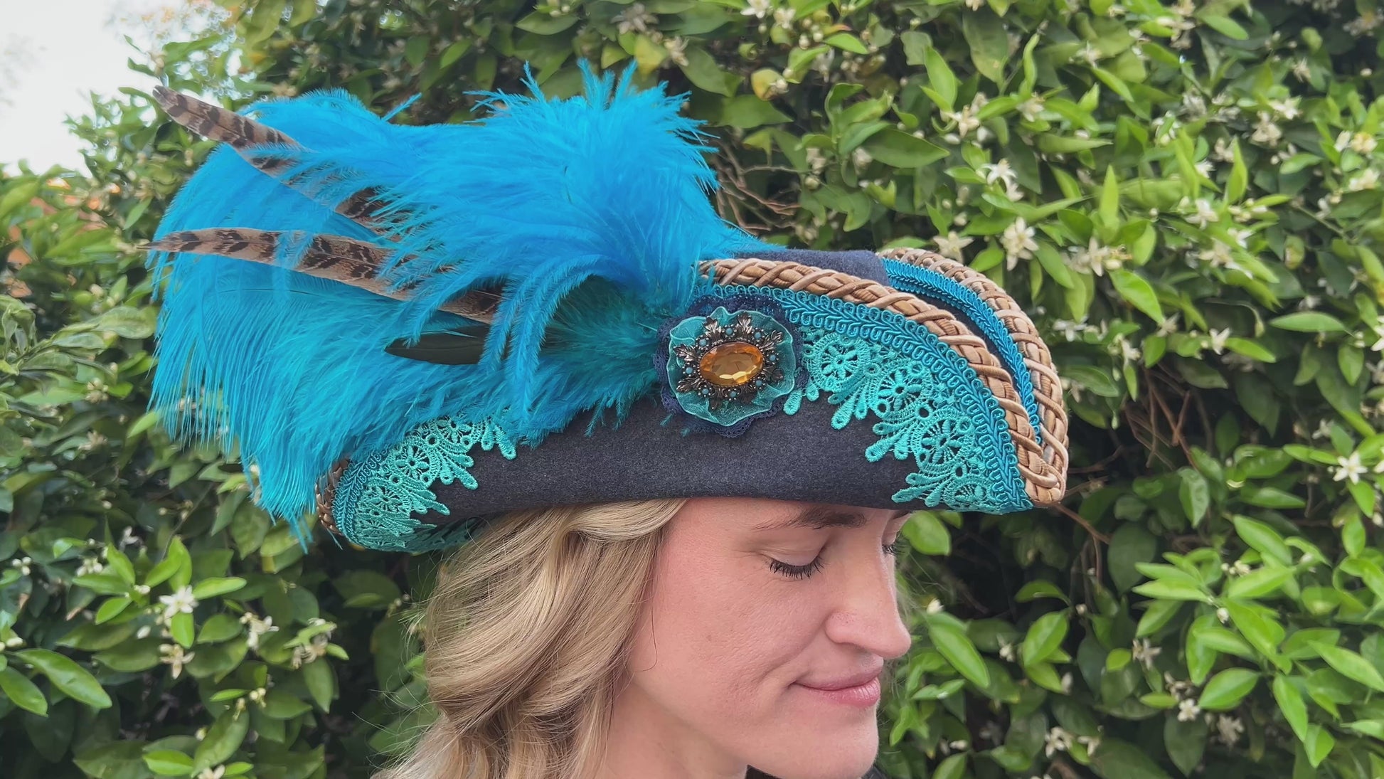 Bicorn Hat 22" Navy Wool Base with Gold/Turquoise Trim, Feathers, and Brooch