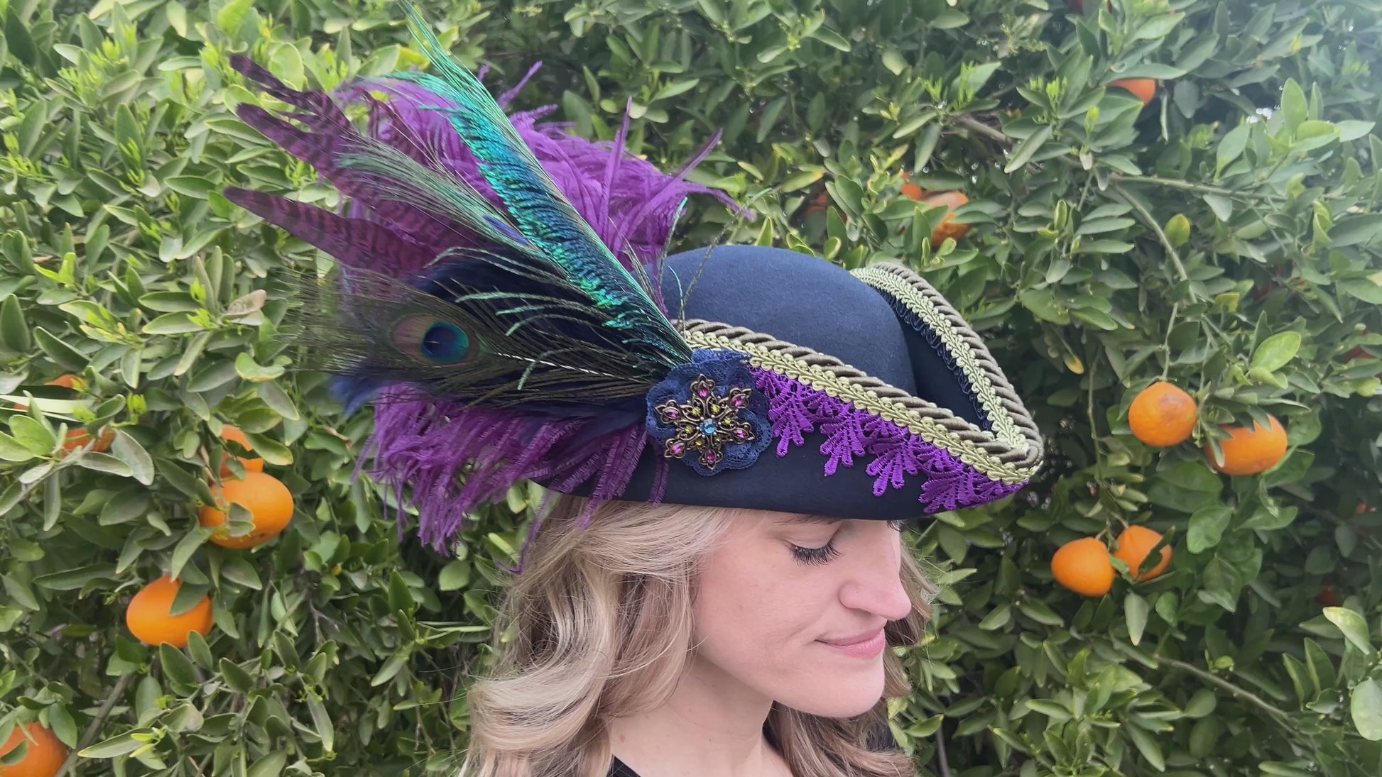 Bicorn Hat 22" Navy Wool Base with Purple/Green Trim, Feathers, and Brooch