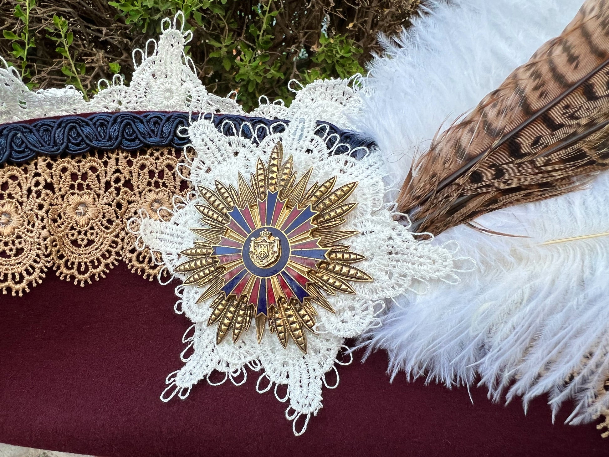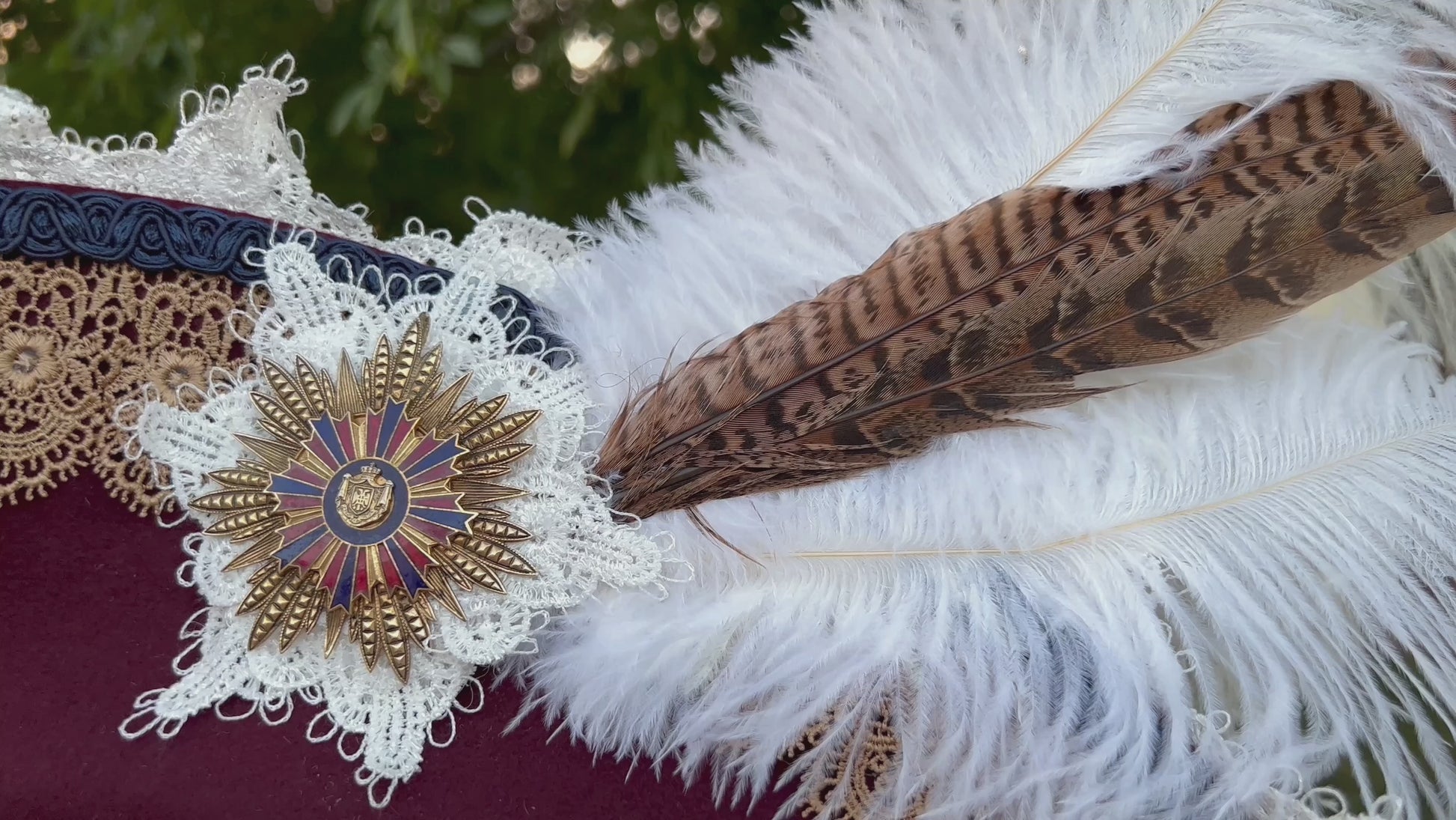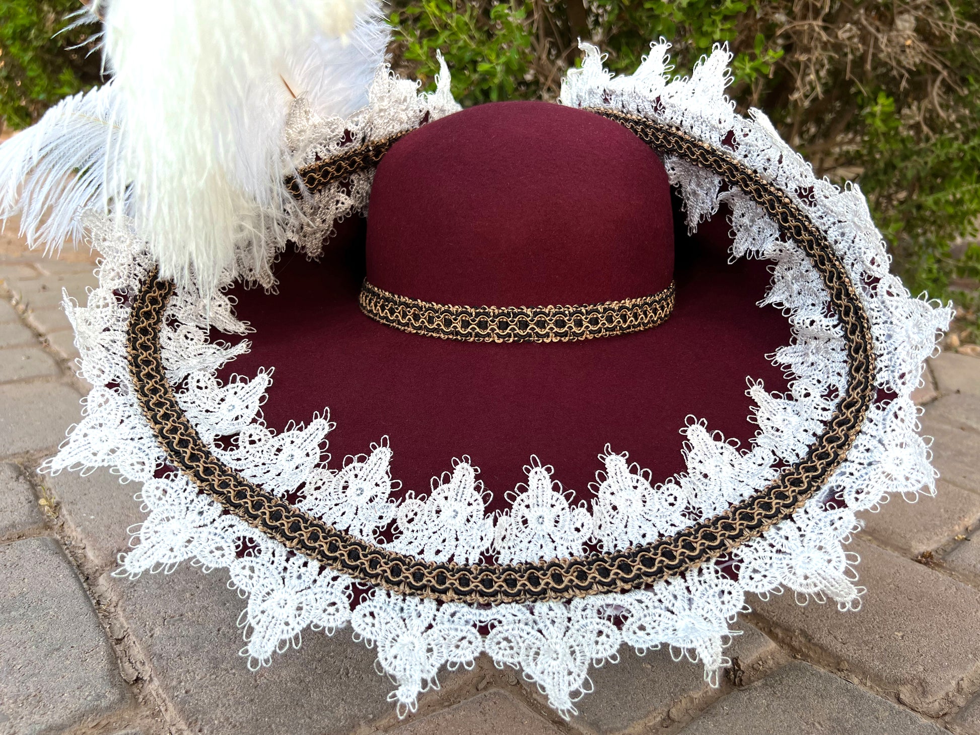 Bicorn Hat 23" Maroon Wool Base with Navy/Gold Trim, Feathers, and Military Brooch
