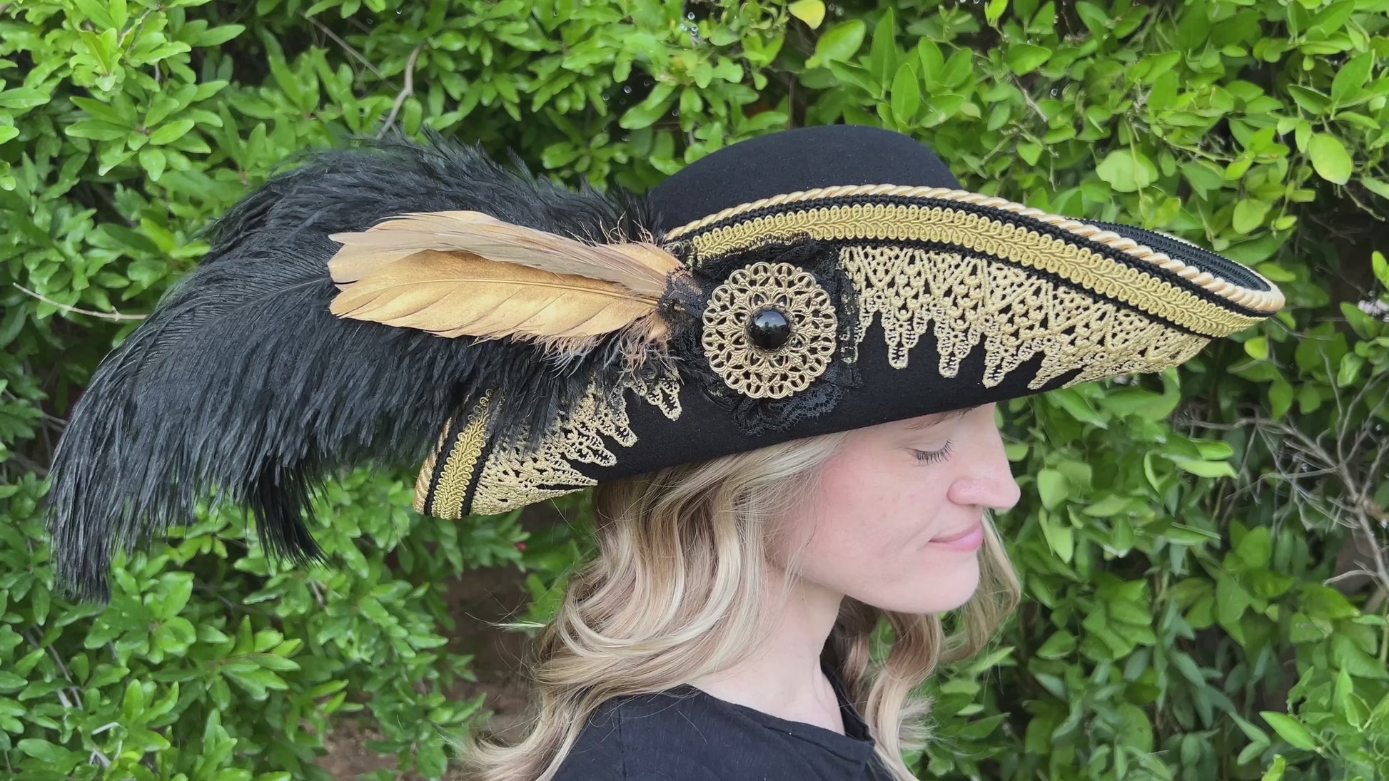 Cavalier Hat 22" Black Polyester Base with Gold Trim, Feathers, and Brooch