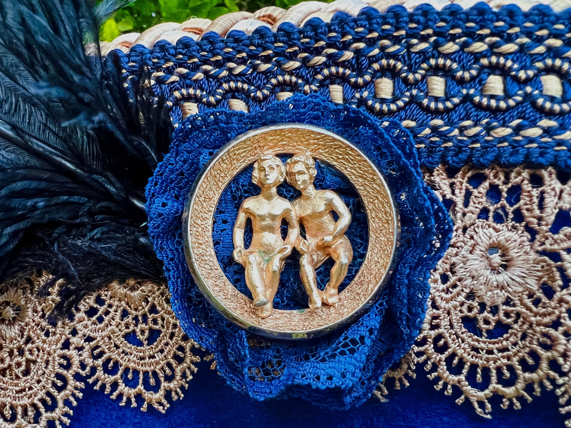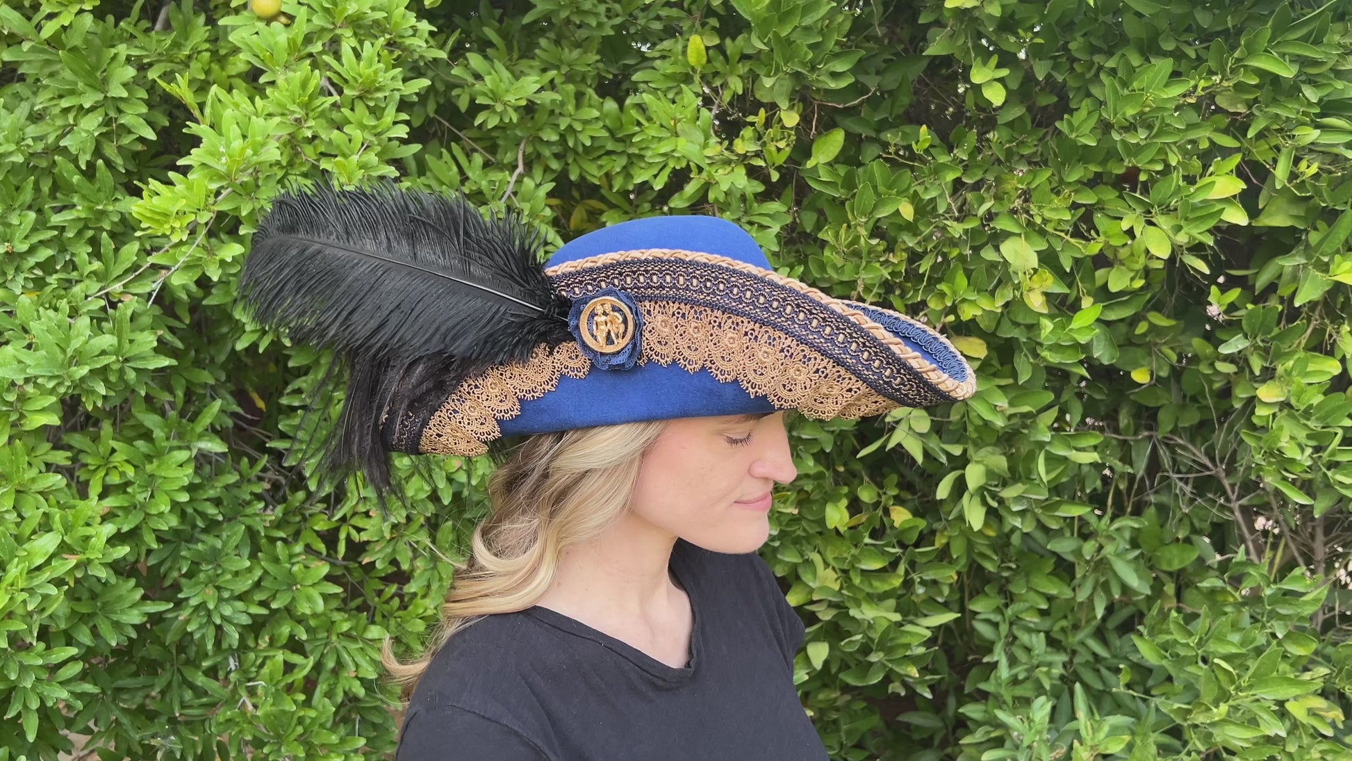 Cavalier Hat 22" Blue Wool Base with Antique Gold Trim, Feathers, and Brooch