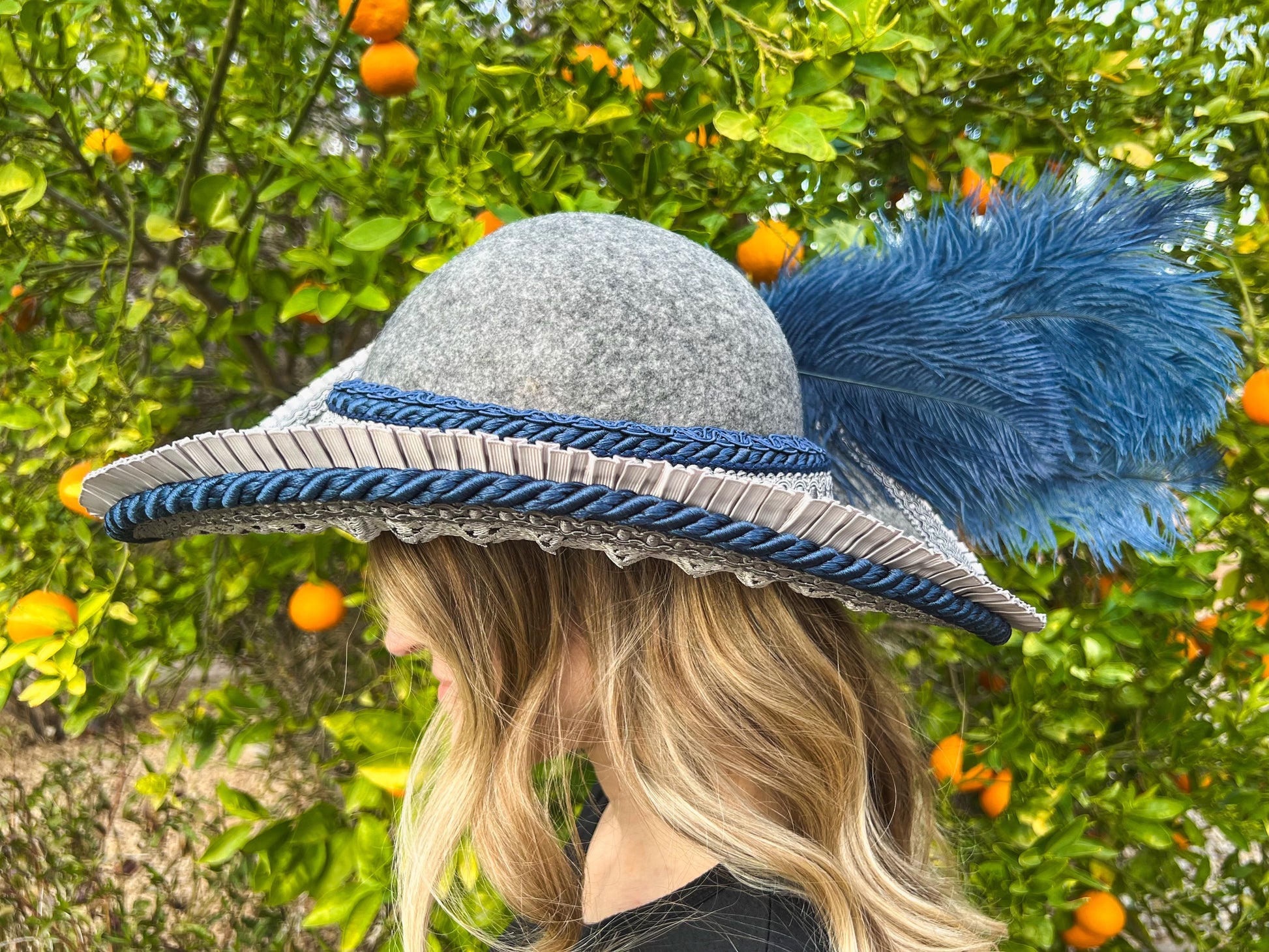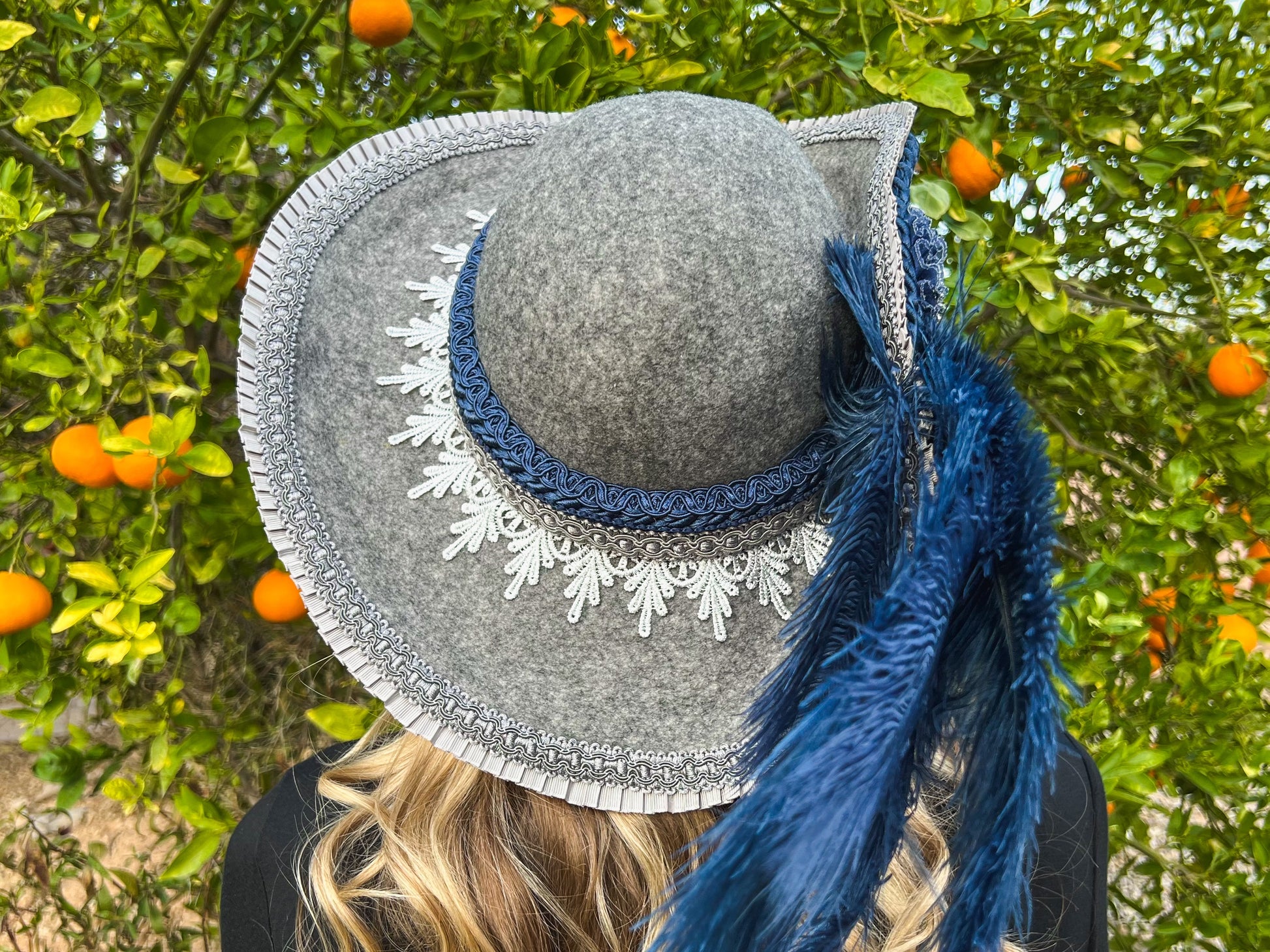 Cavalier Hat 22" Grey Wool Base with Navy Trim, Feathers, and Silver Brooch