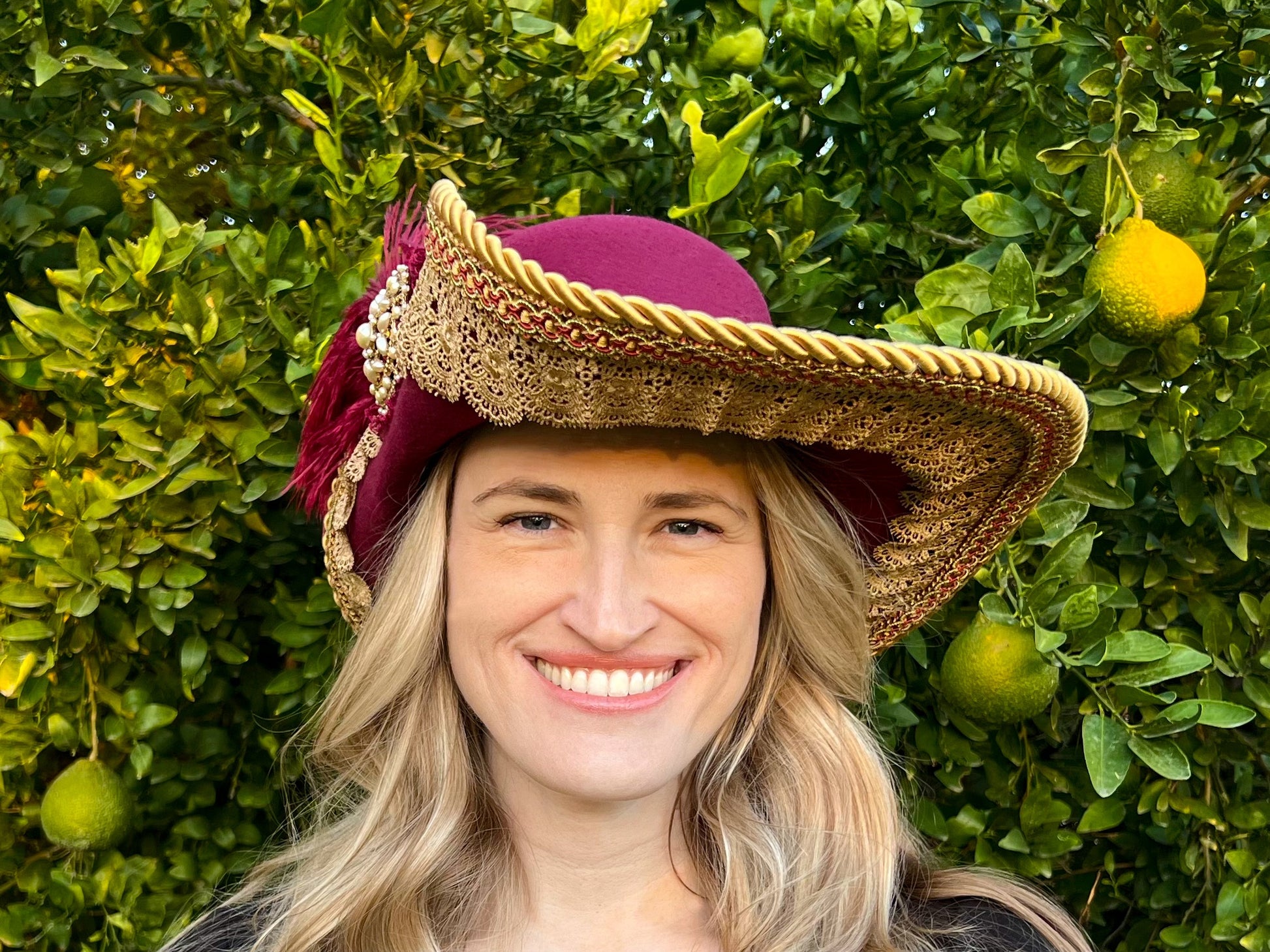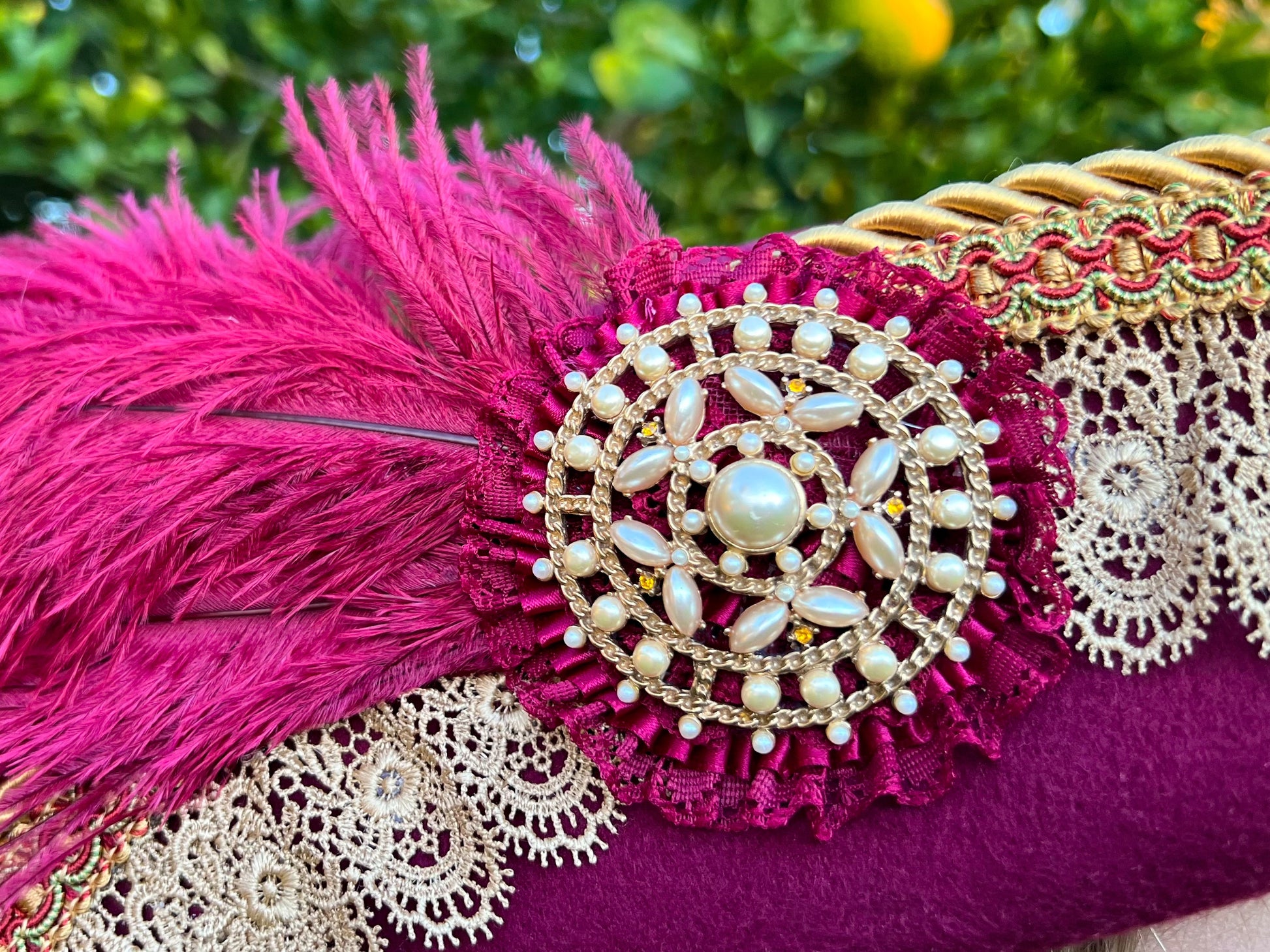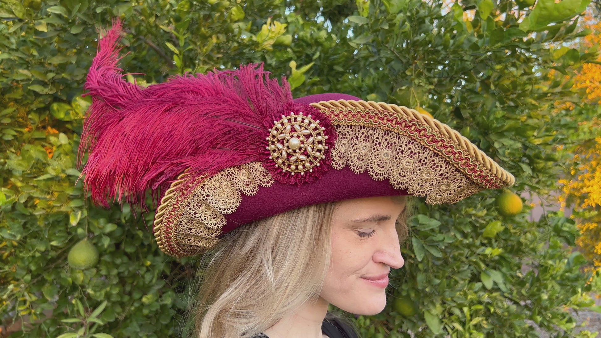 Cavalier Hat 22" Maroon Polyester Base with Gold Trim, Feathers, and Pearl Brooch